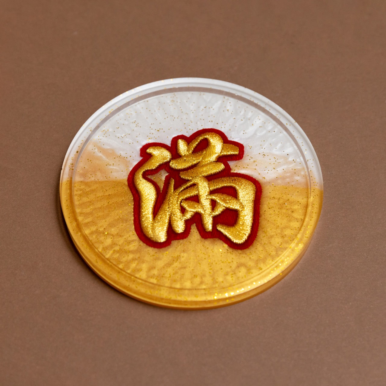 Elevate your Lunar New Year celebrations with Shevron's exquisite Embroidered Character Resin Coasters, expertly handcrafted with love. Each coaster features beautifully hand-embroidered Chinese characters in vibrant gold premium German threads, delicately encased in eco-friendly resin, and adorned with gold dust.