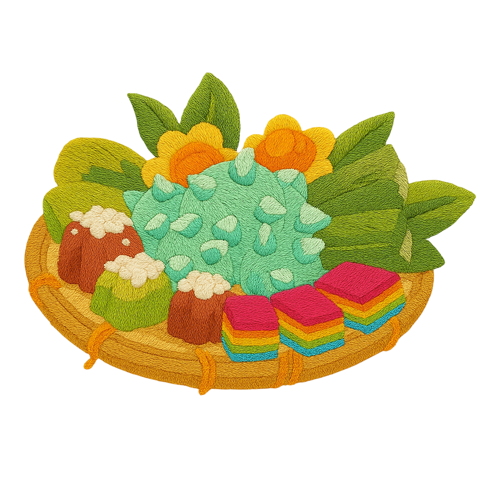 Celebrate tradition with colour and charm — the Kueh Medley T-Shirt brings together beloved Southeast Asian desserts in vibrant embroidery. From rainbow lapis to ondeh ondeh, each stitch tells a story of heritage and sweetness.