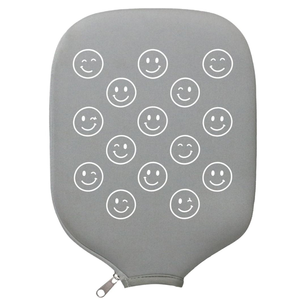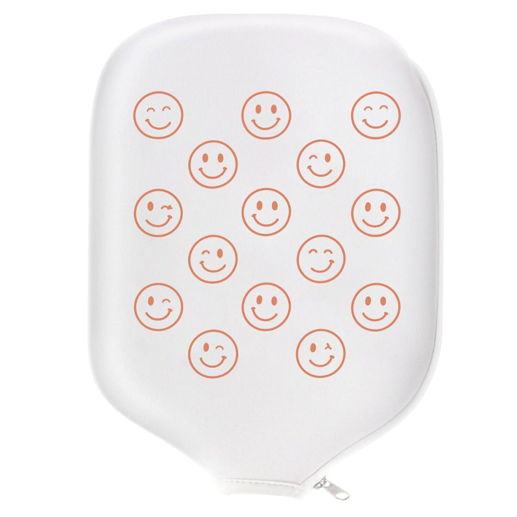 Play happy! This white paddle cover features a pattern of orange smiley faces, adding cheer to every match.